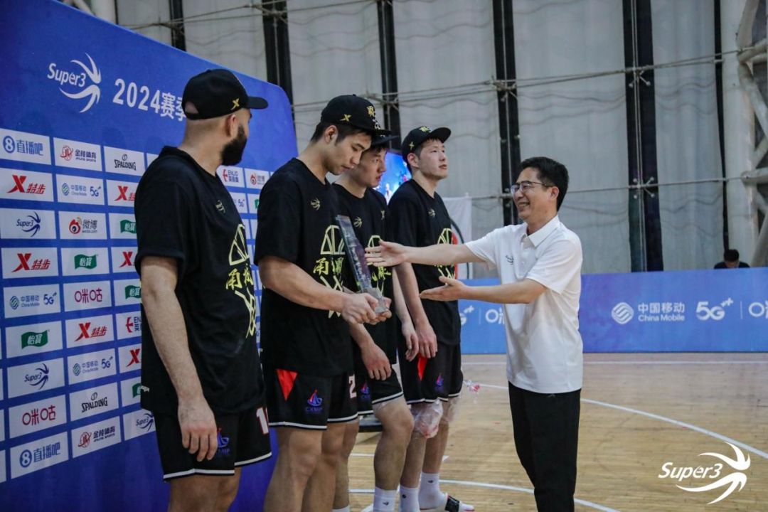 海曙区人民政府副区长黄列先生为上海横沙誉民颁发霸主奖杯,深篮体育(北京)有限公司三人篮球项目部总经理姜冠先生为上海横沙誉民颁发伴手礼。